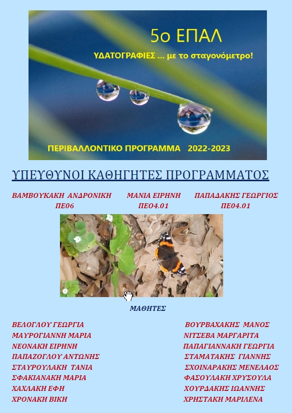 Η περιβαλλοντική ομάδα του 5ου ΕΠΑΛ Ηρακλείου πραγματοποίησε με επιτυχία και την φετινή χρονιά 2022-2023,Περιβαλλοντικό Πρόγραμμα με τίτλο : «ΥΔΑΤΟΓΡΑΦΙΕΣ ...με το σταγονόμετρο», με υπεύθυνους του προγράμματος τους εκπαιδευτικους: κα Βαμβουκάκη Ανδρονίκη ΠΕ06, την κα Μανιά Ειρήνη ΠΕ04.01, και τον κ.Παπαδάκη Γεώργιο ΠΕ04.01